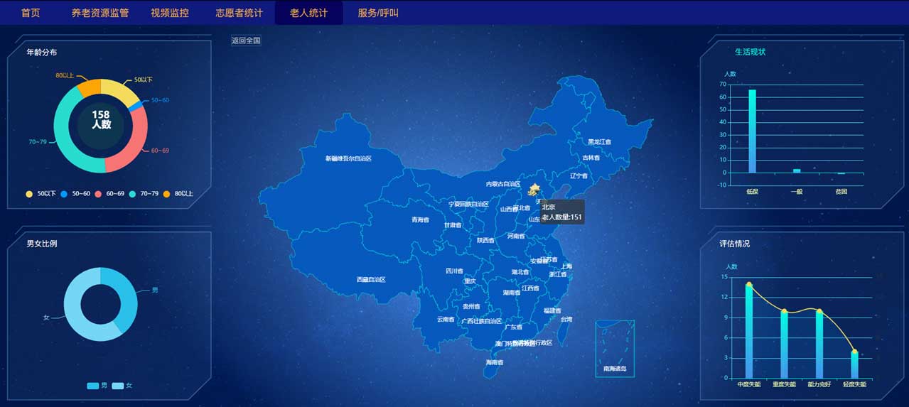 解决养老服务的监管难题,在充分调研参考全国各地政府监管需求以及先进经验的基础上,投入五百万元研发出适合智慧政府管理的综合养老监管平台,通过搭建智慧养老服务监管平台并实现常态化的运营,实现了养老服务的实时过程监管,通过信息化手段提高民政对养老机构的监管水平,同时实现部门间的信息共享和业务协同。